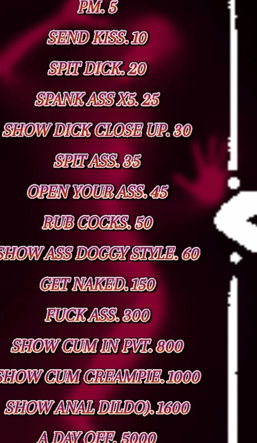 Erotic Dance, Cum Play, Role Play, Sex Toys, Doggy Style, Ahegao, Anal, Fingering, Humiliation, Masturbation, Cock Rating, Ass to Mouth, Dildo or Vibrator, Double Penetration, Anal Toys, Oil Show, Heels, Handjob, Kissing, Rimming, Threesome, Orgasm, Massage, Blowjob, Cock Ring, Cumshot